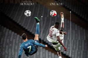身高2.01米的奥努阿楚,日前打进一粒精彩的倒钩进球,触球点高度达2.41米。当年C罗的天秀倒钩触球点高度为2.38米。