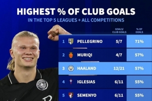 体育资讯10月7日讯 德国转会市场统计了本赛季球员进球占比,哈兰德攻入曼城57%的进球,占比第三高,姆巴佩54%、凯恩47%。