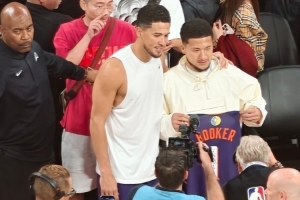 几分相似?布克赛后与其模仿者“中国布克”合影