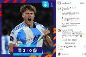 体育资讯10月13日讯 世青赛(U20世界杯)1/4决赛,阿根廷2-0击败墨西哥,晋级四强。