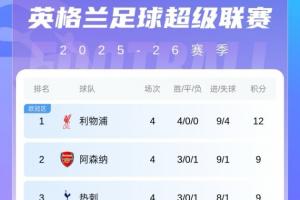 最新英超积分榜形势如图:
