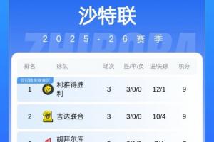 三轮过后,利雅得胜利和吉达联合都是9分,排名联赛前两位。