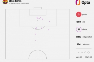 本赛季,奥尔莫在西甲中11脚射门均未能破门得分。在没有取得进球的球员中,仅伊纳基-威廉姆斯和阿斯普里拉所用射门次数更多。