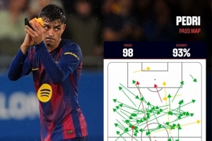 西甲官方社媒晒出佩德里此役的传球路线图,他传球98次,关键传球4次,传球成功率93%。