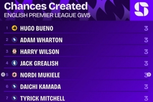 体育资讯9月24日讯 英超第5轮战罢,squawkafootball列各项数据排行,在创造机会方面,狼队后卫乌戈-布埃诺等8名球员各创造3次机会。