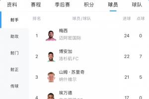 美职联射手榜,梅西23场24球0点球居首,洛杉矶FC前锋博安加22球7点球第二。