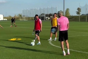 德保罗挑战梅西,看看谁能从球门后面射门进球,梅西轻松完成挑战。