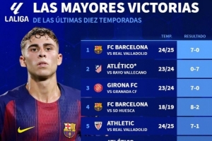 体育资讯9月15日讯 西甲第4轮比赛,巴萨在主场以6-0的比分大胜瓦伦西亚。今年1月,红蓝军团曾以7-1的比分大胜同样的对手。德国转会市场盘点了西甲近10赛季最大比分赢球top10,巴萨5次上榜。